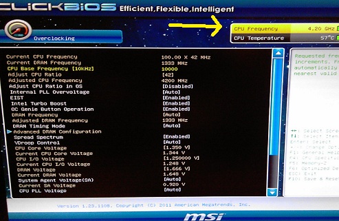I have an Intel 2600K processor on a MSI mainboard and using overclock genie II. My system is overclocked to 4.2GHz as seen in the screen below taken from my bios setup.
