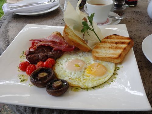I had a farmhouse breakfast, which had a drizzle of what seemed like mixture of olive oil and maybe basil pesto, which really brought out a lot of flavour, and a small fillet steak, which was a perfect medium rare, and super tender, eggs, bacon, potato wedges, mushrooms and toast. My wife had a stack of french toast, bacon and banana, which came with cream on the side and a fancy sugar decoration thing.